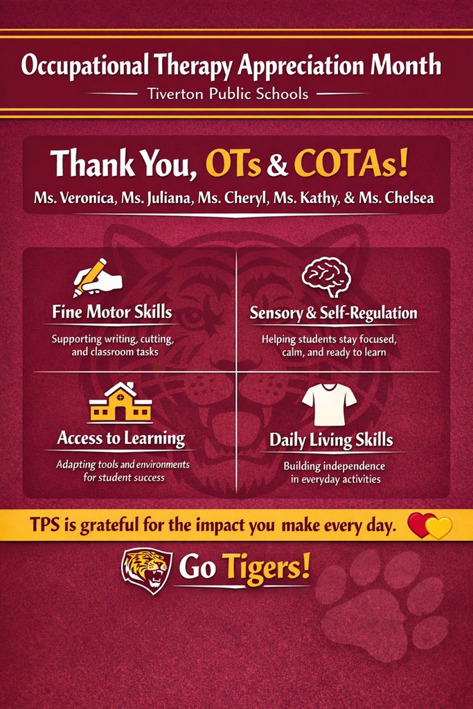 šŸŽ‰ April is Occupational Therapy Appreciation Month! šŸŽ‰ Tiverton Public Schools is proud to celebrate and thank our incredible OTs & COTAs — Ms. Veronica, Ms. Juliana, Ms. Cheryl, Ms. Kathy, and Ms. Chelsea — for the meaningful impact you make every single day. šŸ’› From strengthening fine motor skills āœļø to supporting sensory regulation 🧠 to expanding access to learning šŸ« to building independence in daily living 🧩 …you help our students thrive in and out of the classroom. We are so grateful for all that you do! ā¤ļøšŸ’› #OTMonth #ThankYouOTs #TPSPride #GoTiger
